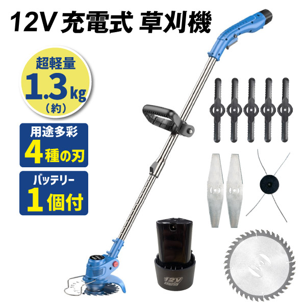 草刈り機 充電式 電動 バッテリー1個/4種の替刃付き 12V充電式お手軽草刈機 強力 静音 家庭用 軽量 パワフル グラストリマー kusakari 国華園