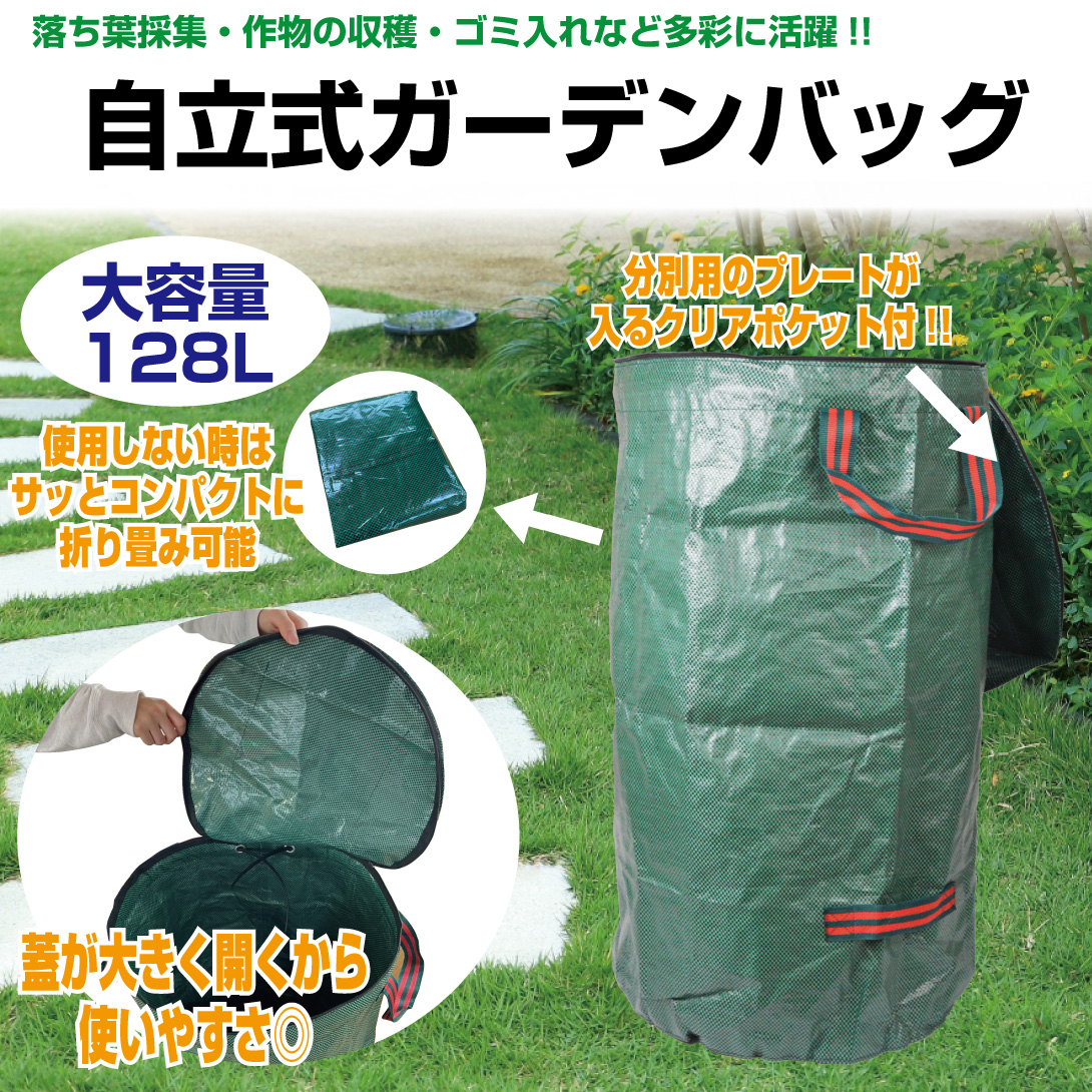 ガーデニング 自立式 ガーデン バッグ 1個 128L 蓋付 落ち葉 袋 ガーデンバケツ 収穫 集草 清掃 ゴミ バッグ 折りたたみ クリアポケット 国華園