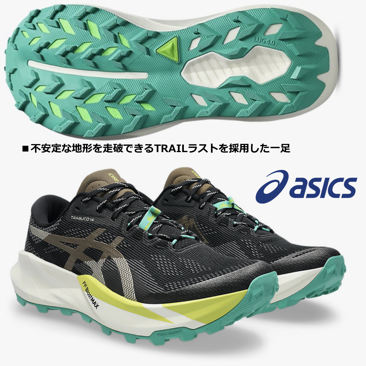 ASICSGRIPがアウターソールに配置されており、オフロードでの高度なトラクションを追求します。