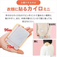 ミニサイズの衣類に貼るタイプの使い捨てカイロ!ちょっと寒い時にかさばらないミニサイズ冬の必需品です。足腰の冷え、通勤通学、屋外作業、レジャー・スポーツ観戦にお勧めです。※製品は予告なく仕様を変更する場合がございます。あらかじめご了承ください。 【製品仕様】平均温度:50度最高温度:60度持続時間:約10時間 【主要材質】鉄粉、水、バーミキュライト、活性炭、塩類、高吸水性樹脂、木粉 【サイズ】幅約9.6×高さ7 【生産国】日本