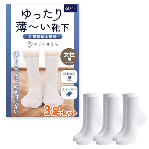QQOLi ゆったり薄いタイプ 介護 靴下 痛くない 締め付けない (介護士監修) 楽々 着脱 高齢者 シニア 女性用 22.5-24.5cm