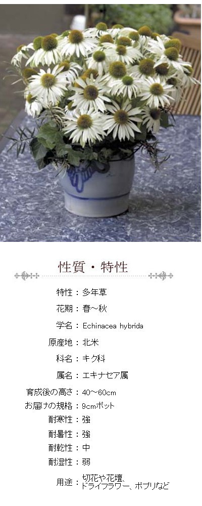 ホワイトの花色が非常に魅力的なエキナセアです。