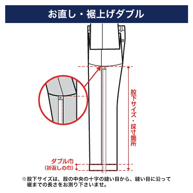 | 股下サイズは、平置きして、股の中央の十字の縫い目から、縫い目に沿って裾までの長さをお測りください。 |