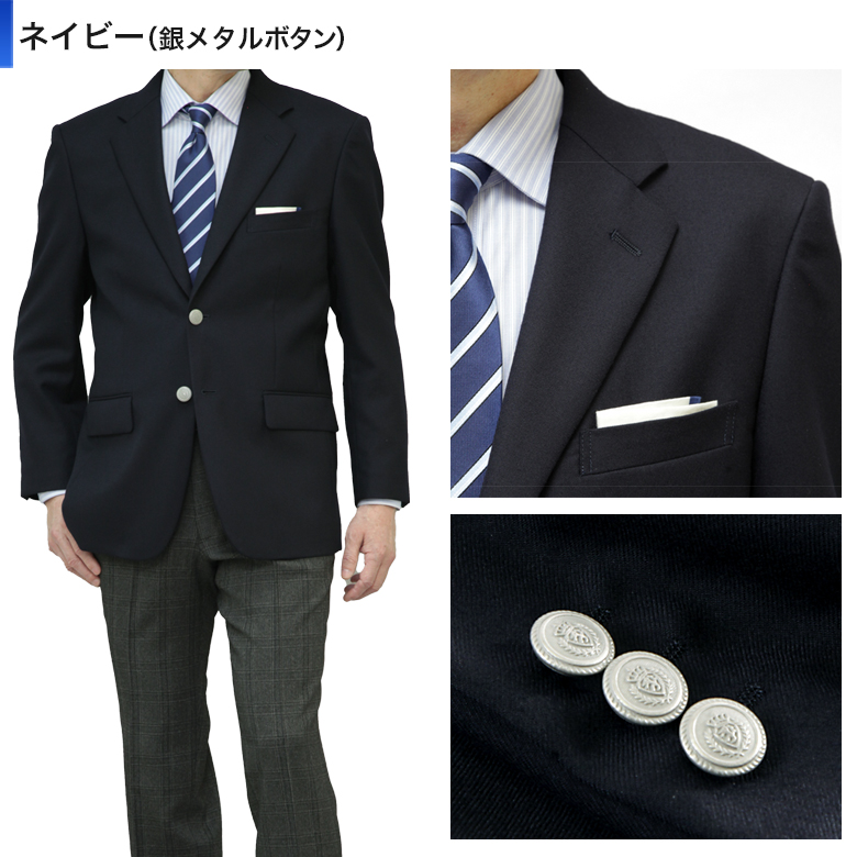 | スポーティーな服の代表的存在 紺ブレザー・シングル2ツボタン フォーマルなスタイリングも可能なオールマイティウェア。ブラックに近い深みのあるネイビーの表生地・マットシルバーのメタルボタン。ボタンをゴールドではなくマットシルバーを使用することで、落ち着きのある上品な雰囲気を醸し出しています。グレーなどの淡色系のスラックスと合わせるのが王道の着こなしです。 やや厚手の生地を使用したクラシックなタイプです やや厚手のサキソニー生地(ウール100%)を使用しています。近年の生地は、秋冬物でも軽量化を重視して薄手となってる傾向が強いのですが、そういった紺ブレザーよりも、生地にクラシックな肉厚感を求められる方にお勧めです。 |