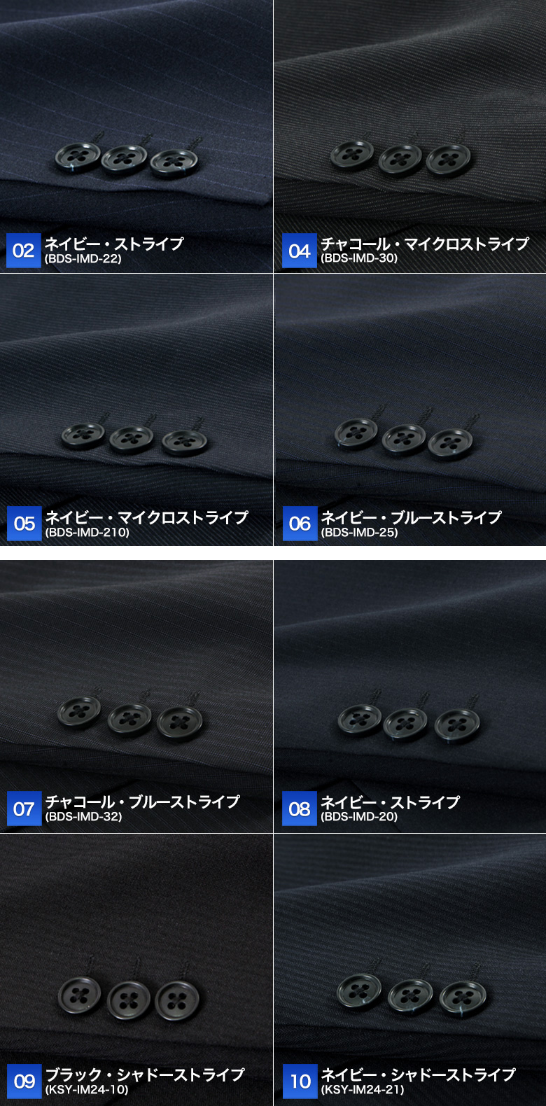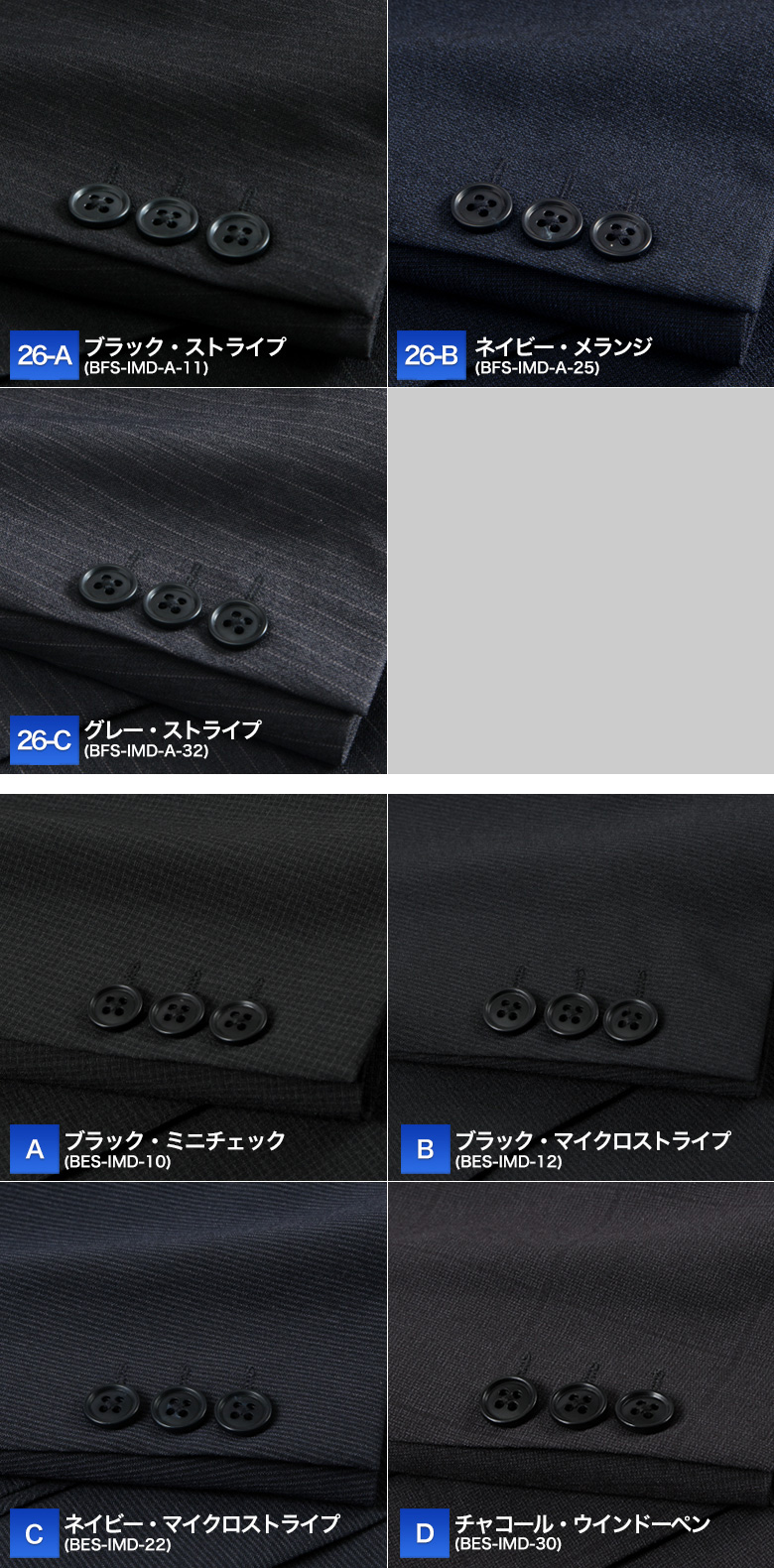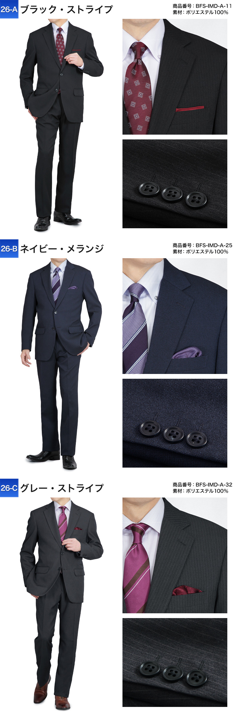 | 【26-A】ブラック・ストライプ(BFS-IMD-A-11) 【26-B】ネイビー・メランジ(BFS-IMD-A-25) 【26-C】グレー・ストライプ(BFS-IMD-A-32) 【A】ブラック・ミニチェック(BES-IMD-10) 【B】ブラック・マイクロストライプ(BES-IMD-12) 【C】ネイビー・マイクロストライプ(BES-IMD-22) 【D】チャコール・ウインドーペン(BES-IMD-30) 【02】ネイビー・ストライプ(BDS-IMD-22) 【04】チャコール・マイクロストライプ(BDS-IMD-30) 【05】ネイビー・マイクロストライプ(BDS-IMD-210) 【06】ネイビー・ブルーストライプ(BDS-IMD-25) 【07】チャコール・ブルーストライプ(BDS-IMD-32) 【08】ネイビー・ストライプ(BDS-IMD-20) 【09】ブラック・シャドーストライプ(KSY-IM24-10) 【10】ネイビー・シャドーストライプ(KSY-IM24-21) ※2026年2月より新たな色柄を追加して発売しております。 |