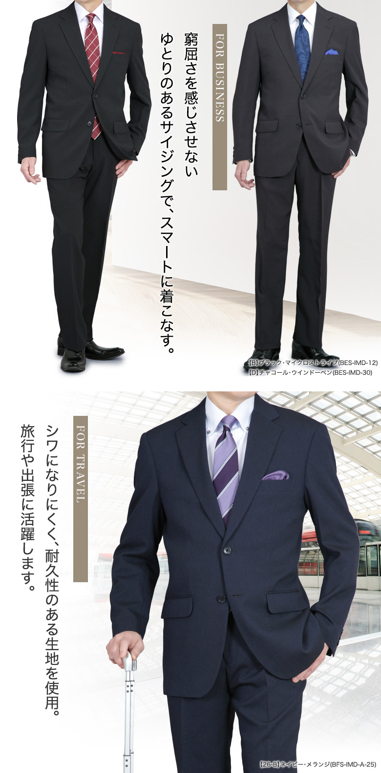 | 【レギュラースタイル・ゆとりあるサイジングのスーツです】 全体にゆとりのあるシルエット、落ち着いた大人のビジネスマンにおすすめです。ジャケットは背抜き仕立てで春夏秋のスリーシーズン対応で長期間ご着用いただけます。スラックスはワンタックでヒップ、腰周りに程よくゆとりのあるすっきりとしたシルエット。長時間のビジネスワークにもストレスを感じさせないシルエットに仕上げております。素材はシワに強く耐久性、速乾性に優れたポリエステル100%素材でお手入れも簡単、メンテナンス、コストパフォーマンスに優れた素材となります。 |