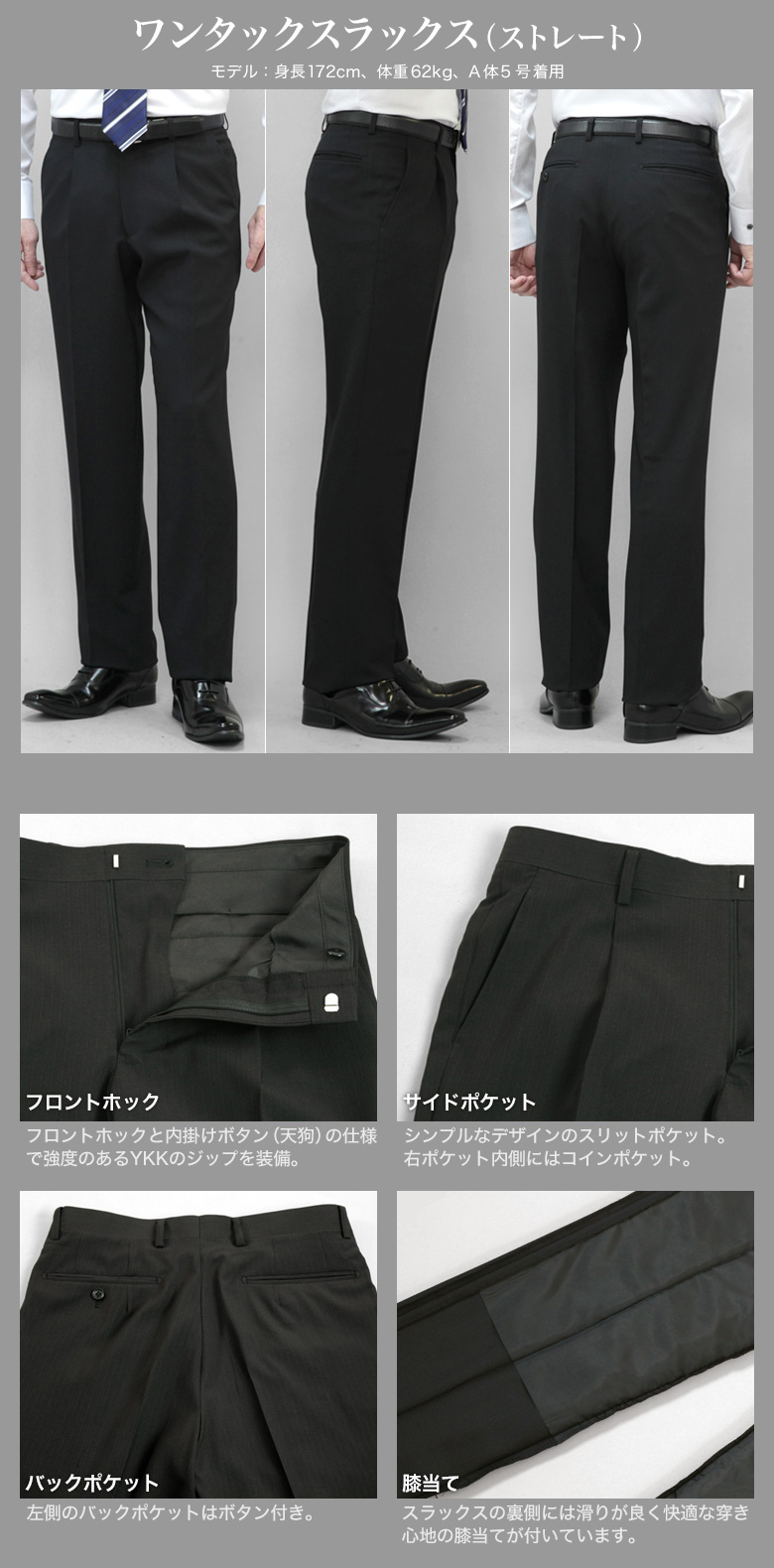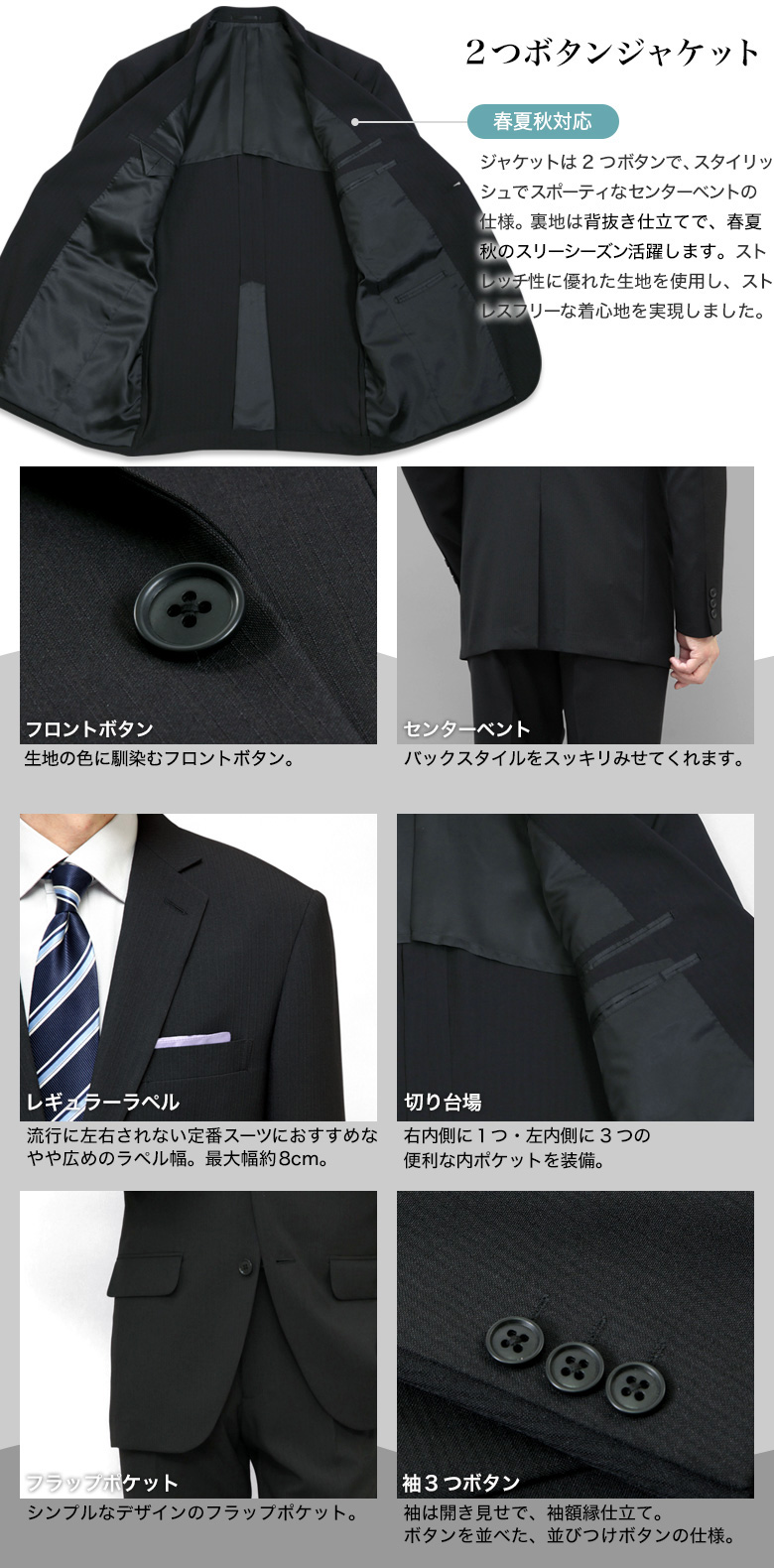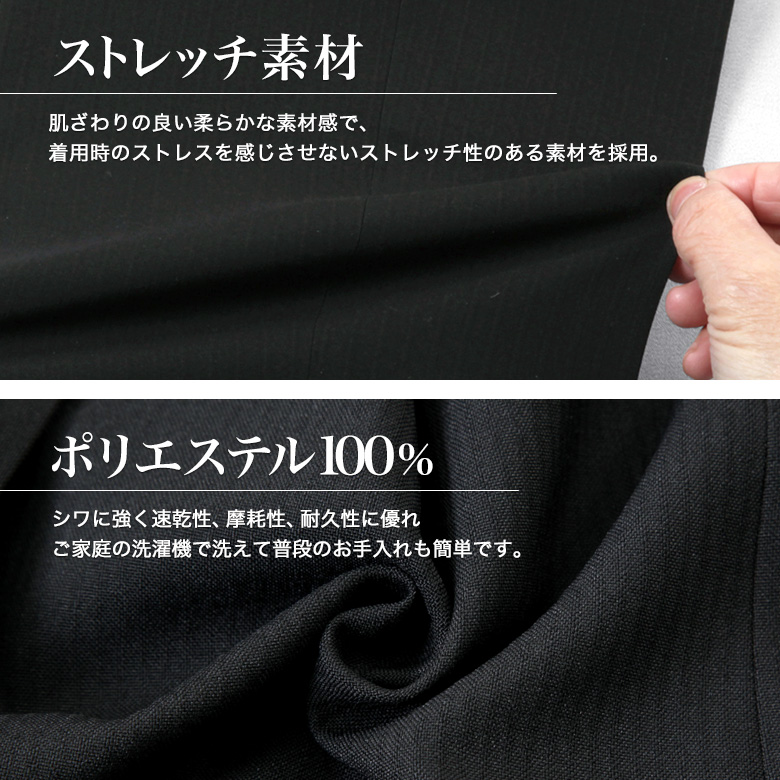 | ▼ジャケット ・2ツボタン ・背抜き仕立て ・袖3ツボタン ・センターベント ・フラップポケット ▼スラックス ・ワンタック ・膝裏付 ・リンクルフリー(防シワ) ・ストレッチ素材 ・プリーツ加工 ・ウォッシャブル (洗濯機で洗える上下ウォッシャブルタイプ) |