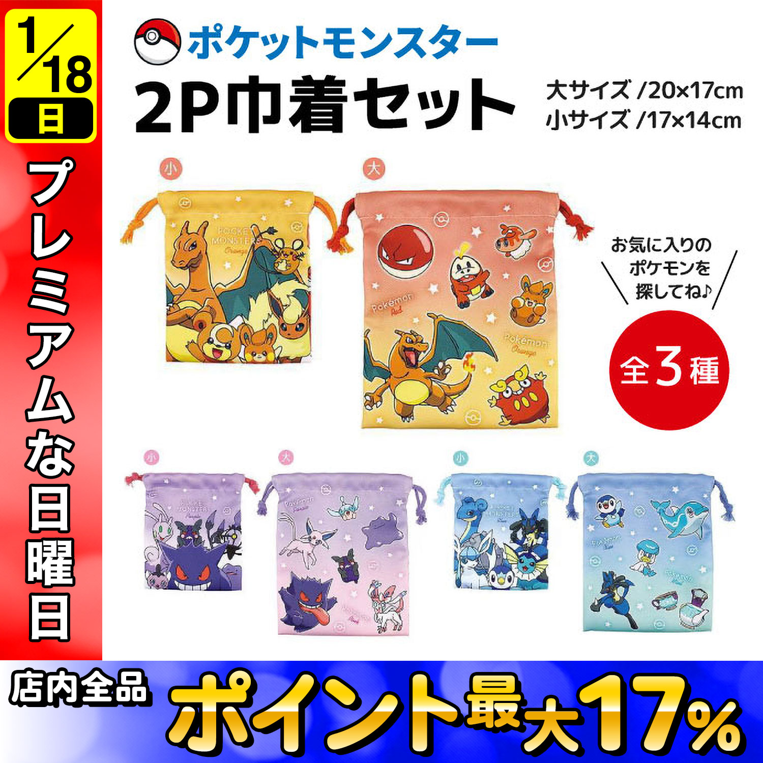 |おでかけ|ポーチ|カードポーチ|ポケカ入れ|巾着|給食袋|小物入れ|ポケモン|ポケットモンスター|リザードン|ルカリオ|ゲンガー|パモ|デデンネ|ブースター|2個セット|