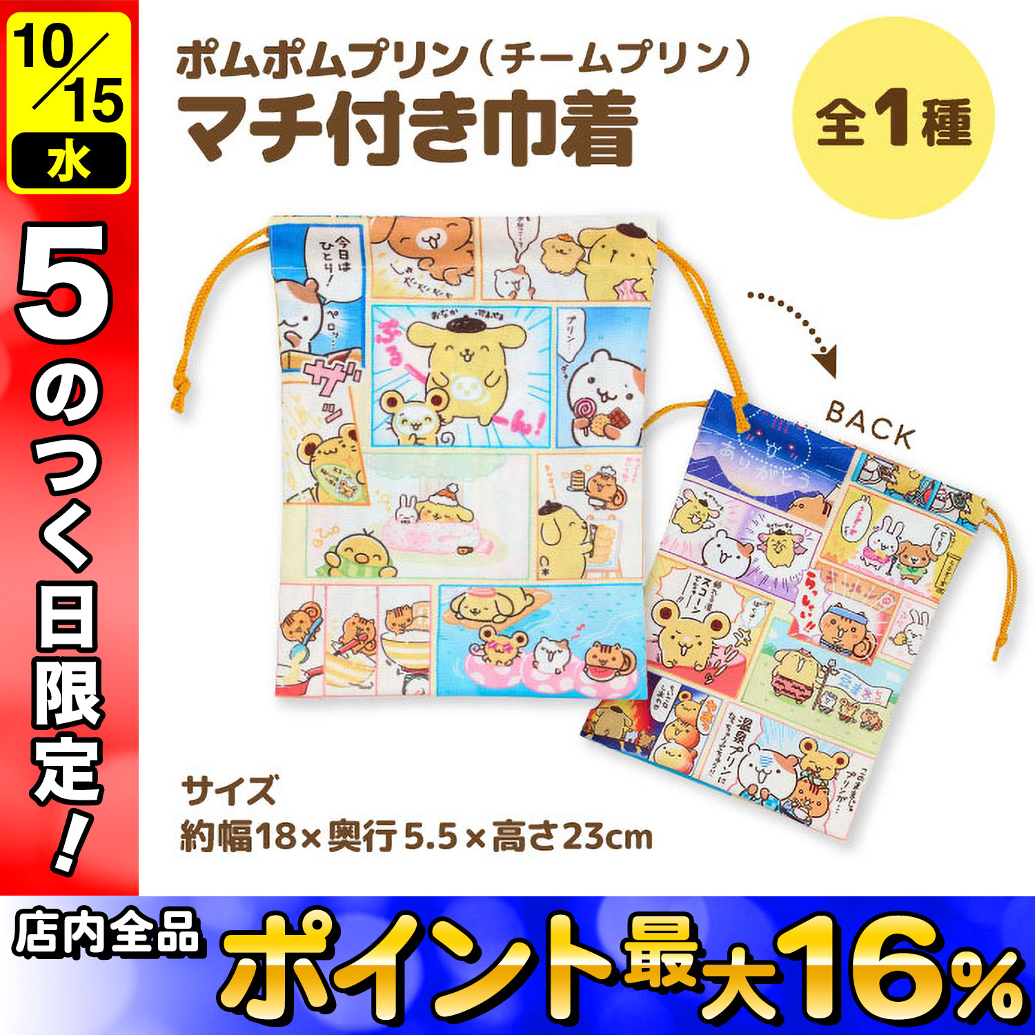 |おでかけ|ポーチ|メイクポーチ|メイク直し|巾着|給食袋|小物入れ|サンリオ|サンリオキャラクターズ|ポムポムプリン|かわいい|チームプチン|漫画|マフィン|スコーン|ベーグル|マチつき|