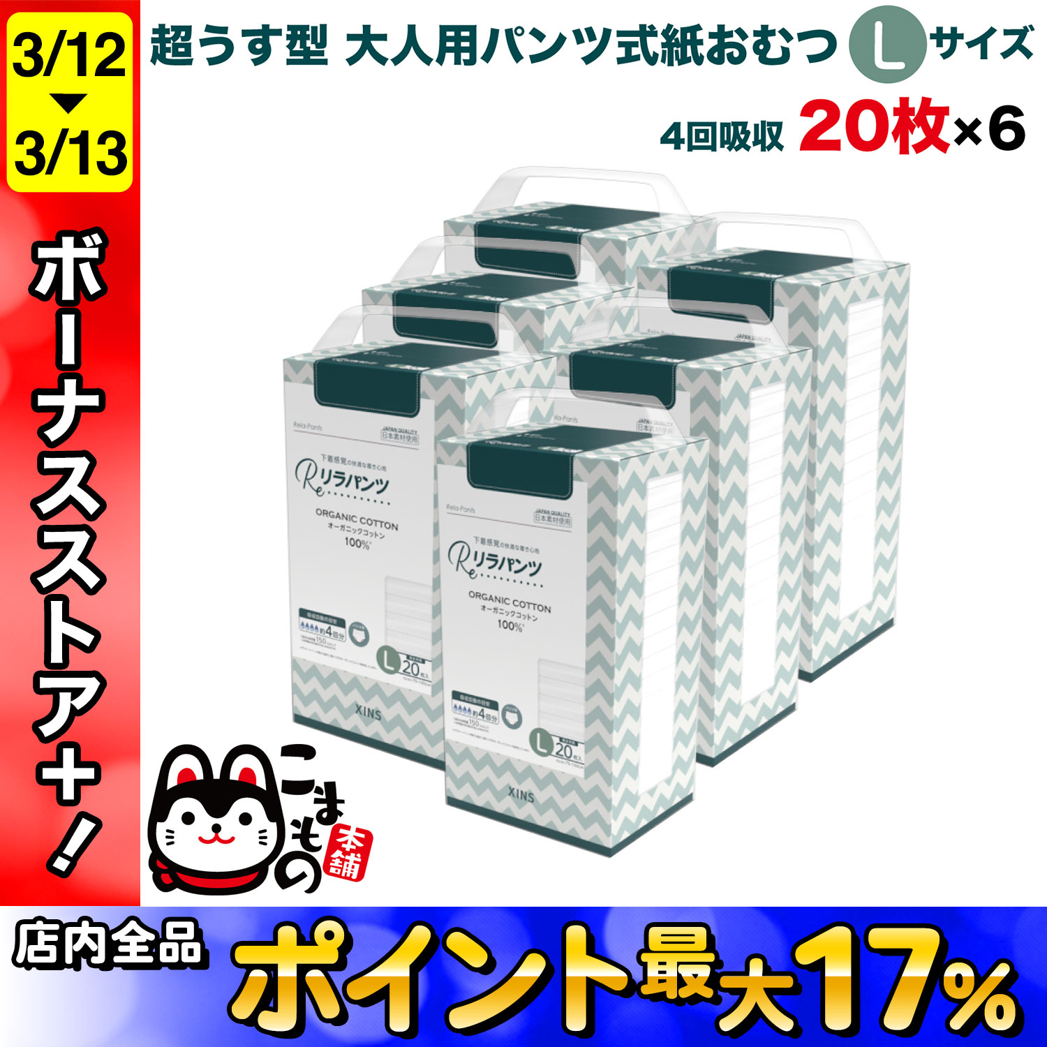 仕様:表面材:オーガニックコットン100% 吸水材:綿状パルプ、吸水紙、高分子吸水材 止着材:ポリオレフィン 伸縮材:ポリウレタン 結合材:スチレン、オレフィン等