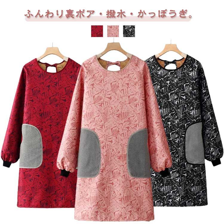 裏ボア裏起毛割烹着かっぽうぎ超あったか袖付エプロン袖口リブ長袖エプロンスモック大人用撥水防水秋冬冬用かっぽう着あったかフリースロング丈暖かい長袖総柄お