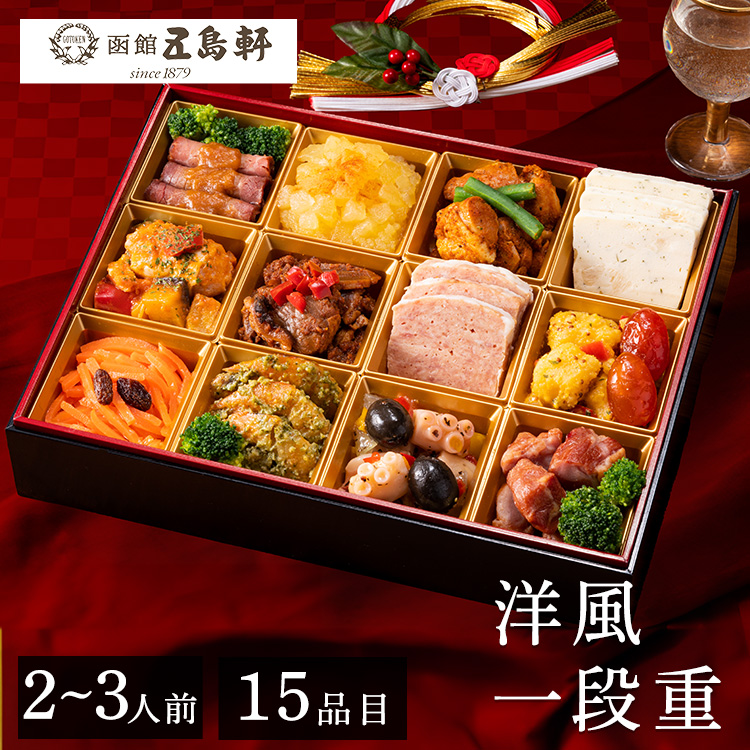 おせち 2025 早割 おせち 予約 送料無料 五島軒 洋風おせち一段重 おせち料理 2~3人前 15品目 (代引不可)(TD)