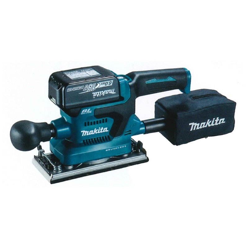 ハイパワーブラシレスモータ搭載。3段変速+定回転制御。フロントグリップを外しての壁際作業も可能。パッド寸法:92×185mm。ペーパー寸法:93×228mm。回転数:高速12000・中速8000・低速4000回転/分。質量:2.1kg(バッテリBL1860B装着時)。標準付属品:本体・ダストバッグ・サンディングペーパー#60・#130・#240各2枚。