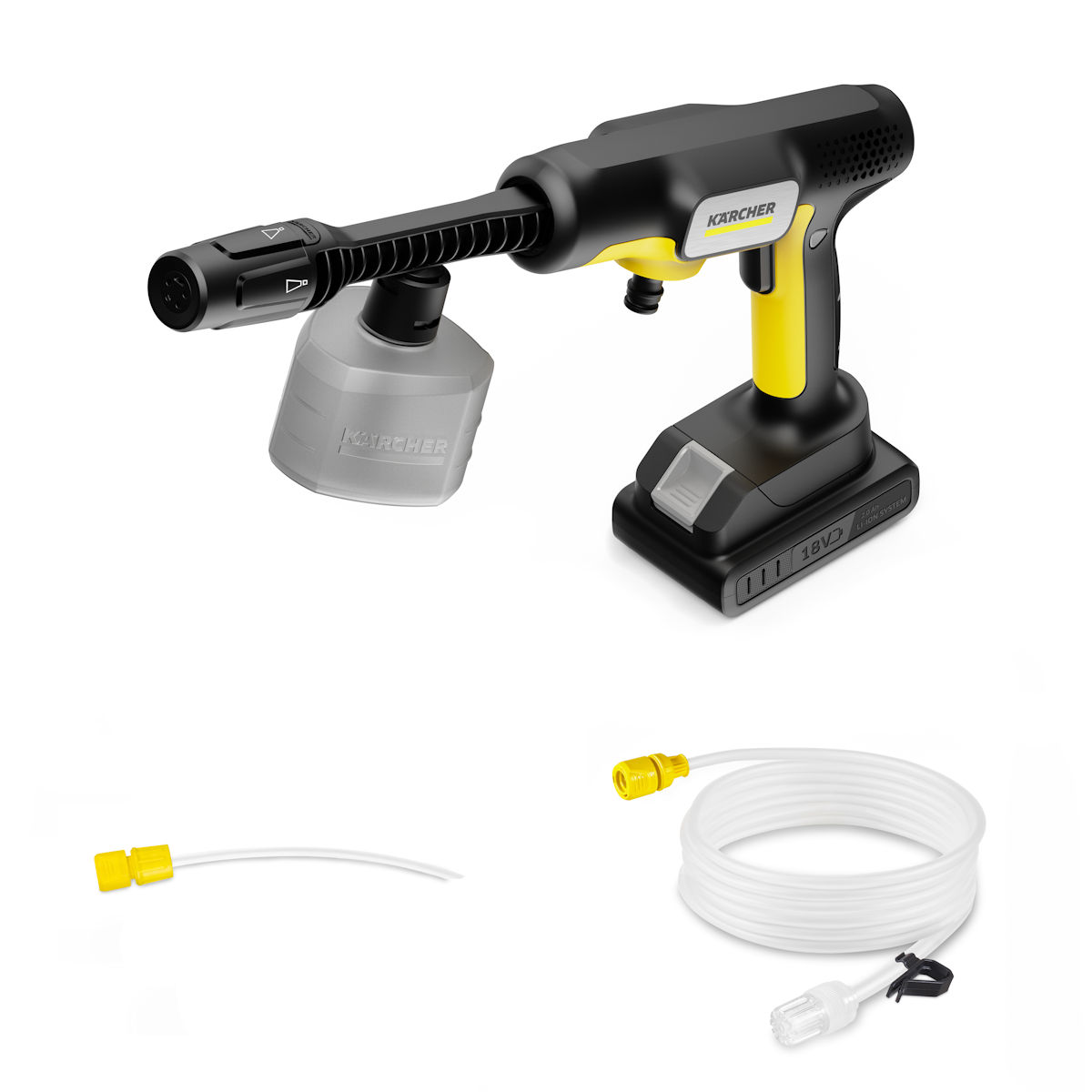 【製品スペック】●最大許容圧力 2.4 MPa●最大吐出水量 150 L / h(自吸時)●音圧レベル 69 dB(標準モード時)●使用可能最大水温 40℃●作動時間 最大約23分(低圧・フォームモード時)●充電時間 5.5時間【付属品】●洗浄剤タンク●5in1ノズル●5m 自吸用ホース(ホースクリップ付)●バッテリーパック 18V/2.0Ah●ペットボトルアダプター●充電USBケーブル(ACアダプターなし)●取扱説明書