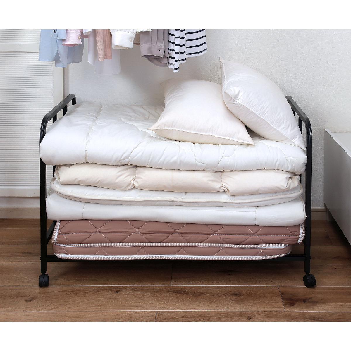 布団や寝具を楽々収納出来る、キャスター付きラックです。