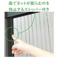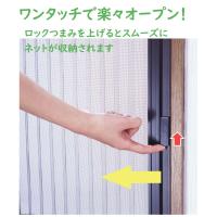 【1枚から無料配達いたします】※佐渡、淡路島以外の離島は除きます。 出入口ドアの内側(室内側)に取り付けるアコーデオン網戸。網はブラック色のプリーツ加工で、コンパクトに自動収納。下枠が柔らかくバリアフリー感覚で通り抜けがスムーズ。下枠が取り外せるので掃除も簡単。