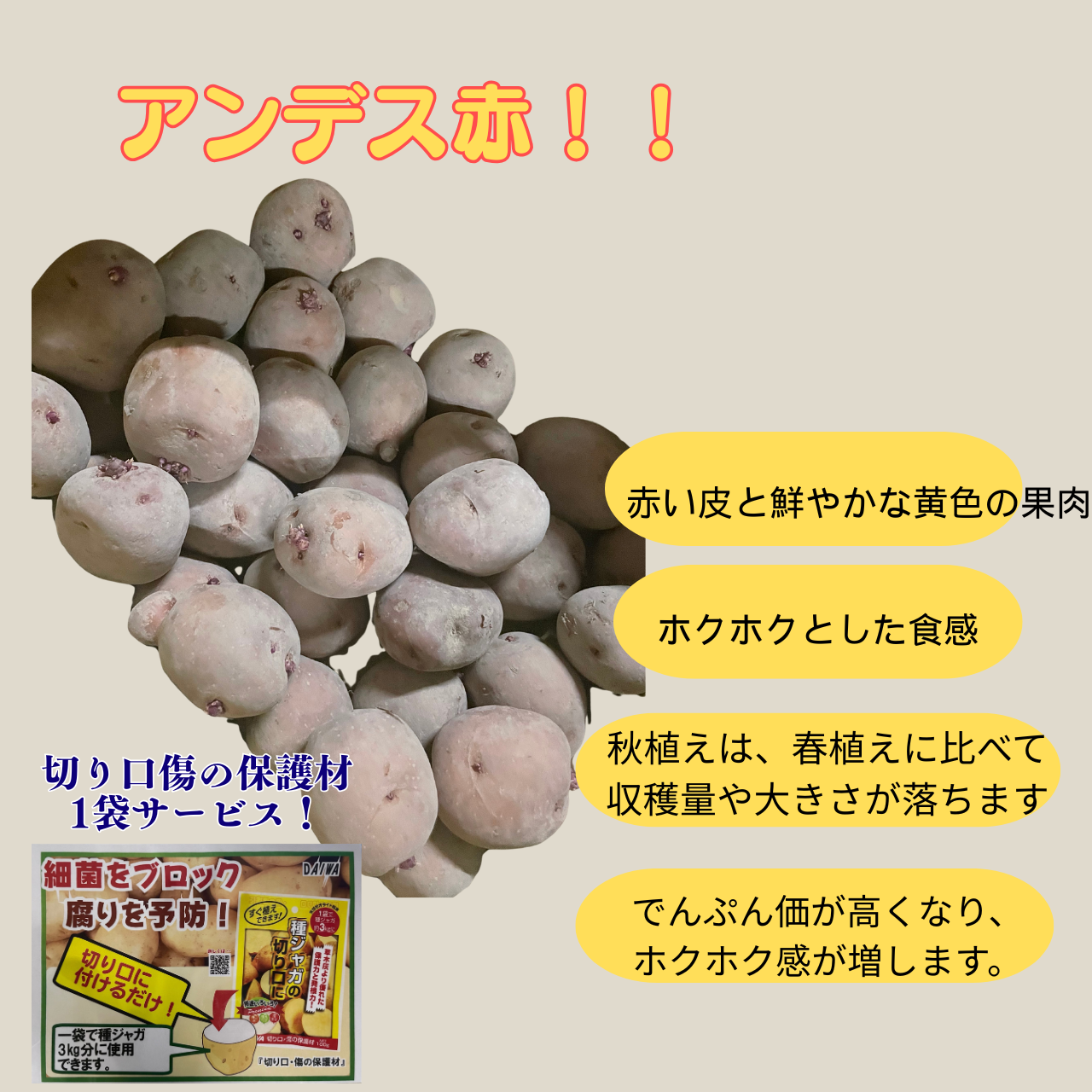 1Kg アンデス赤 ジャガイモ 切り口保護材1袋添付サービス じゃがいも 栽培用 秋ジャガ 種芋 混玉 家庭菜園 秋作 販売 秋植え