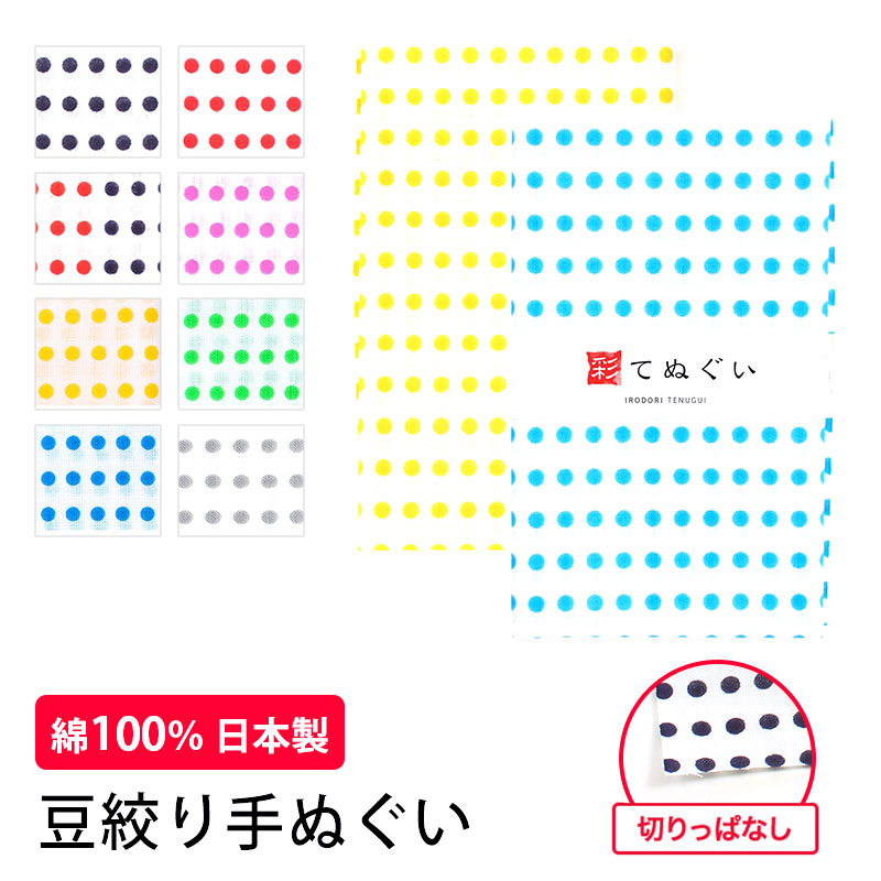 ![]() 豆絞り手ぬぐい単品 切りっぱなし | ![]() 豆絞り手ぬぐい単品 端縫い加工 | ||||
