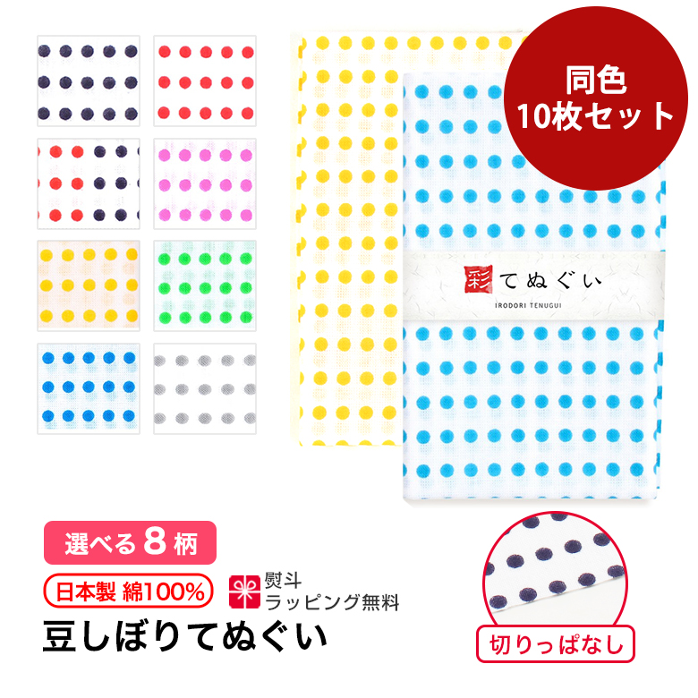 ![]() 豆絞り手ぬぐい10枚セット 切りっぱなし | ![]() 豆絞り手ぬぐい10枚セット 端縫い加工 | ||||