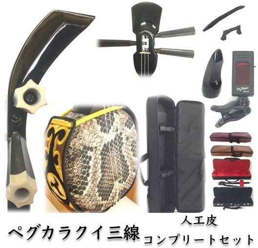 三線 沖縄三線 ペグカラクイ仕様 真壁型 黒塗り 人工皮 初心者向け究極コンプリートフルセット カラクイの悩み不要【カスタマイズオプション付き】