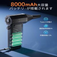 【USB充電式&小型?軽量】8000mAhの大容量バッテリーが内蔵され、最大約2時間(ソフト風)の連続使用ができます。Type-C急速充電で2.5時間にフル充電できます。パソコンやモバイルバッテリーからも充電可能、家、オフィス、車でどこでも充電できます。小型&軽量で持ち運びも便利。お手持ちのバッグや車のダッシュボード内に収納可能です。バーベキューなどのアウトドア、イベントなどには必須のアイテムです。【様々なシーンで大活躍】電動エアダスターには、風力はお好みにより無段階に切り替え可能で、掃除する場所や物に応じて調節できます。コードレスでハイパワーなので屋内・屋外問わずどこでも使えます。キーボードの隙間、PC周り、卓上、エアコン、花粉、火起こし、車内、窓のサッシ、浮き輪の空気入れ、洗車後の水を飛ばし等あらゆる場所で使用可能です。ノズルを外せば広範囲への掃除にも便利です。【パッケージ内容&品質保証】ターボジェットファン本体 *1、ノズル *2、Type-C充電ケーブル *1 収納ケース*1