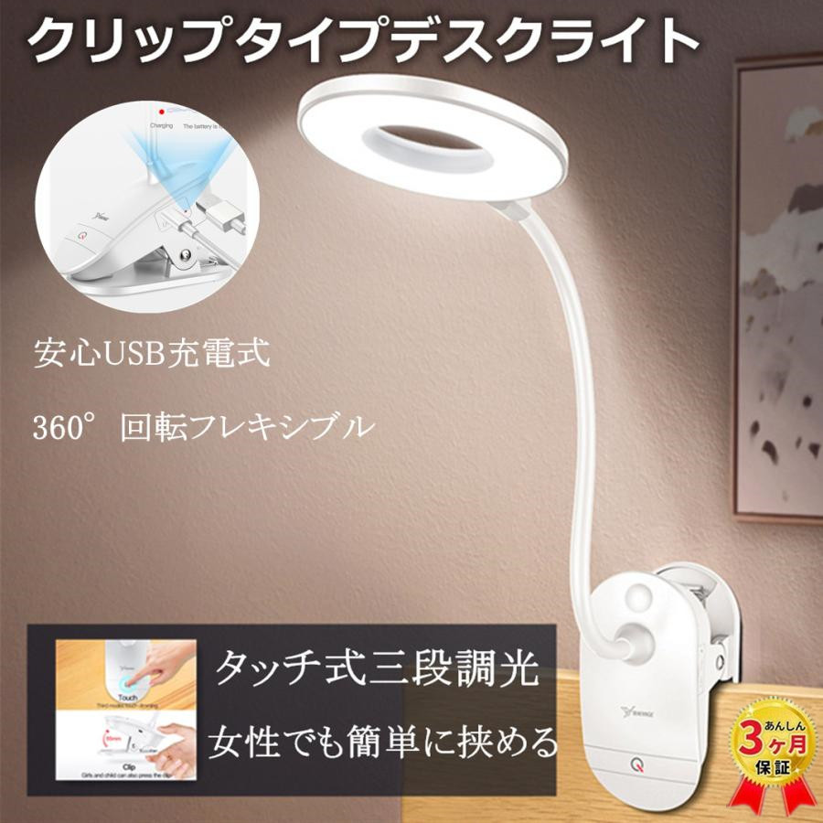 クリップライト テーブルランプ デスクライト スタンド コードレス おしゃれ 目に優しい 3段階調色 明るさ自由 タッチセンサー式 360度回転【3ヶ月保証】