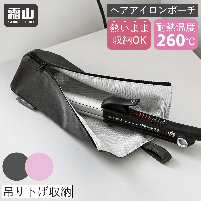 商品詳細 | ●耐熱温度260℃でヘアアイロンを熱いまま収納できる ●底部は三角形の立体デザインで、様々な形を収納可能 ●コードごとすっきり収納できるポケット付き ●ボタン開閉式ストラップで簡単吊り下げ ●撥水素材で洗面台に置いても濡れる心配なし ●旅行や出張などの持ち運びにも |