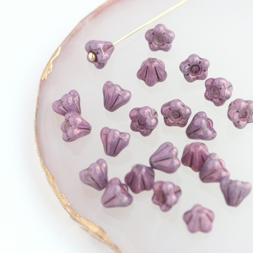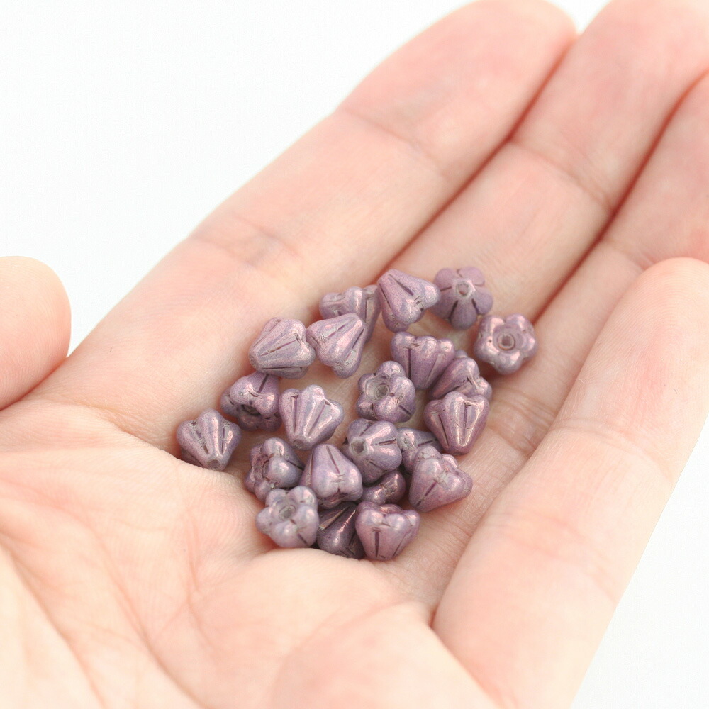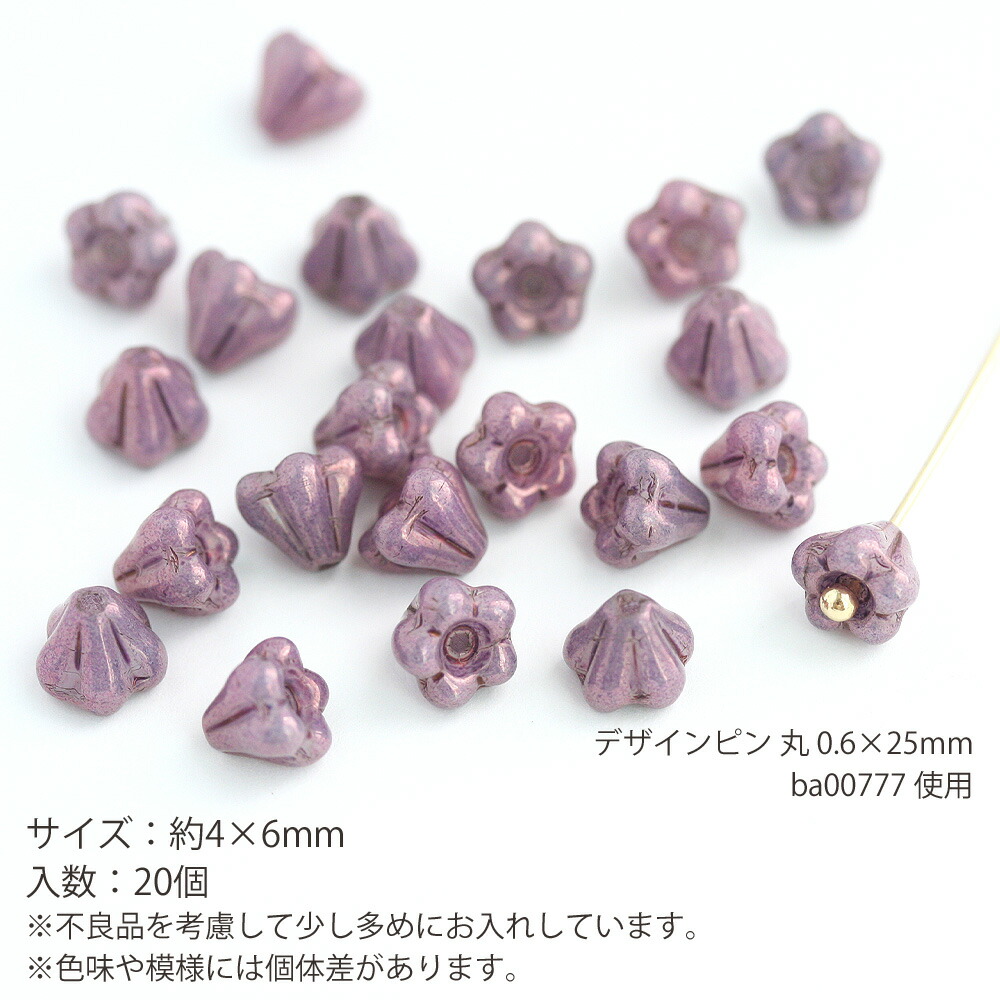 チェコビーズのベルフラワー4×6mmサイズのビーズです。デザインピンや小さなビーズをお花の中心部分に添えるのがおすすめです。