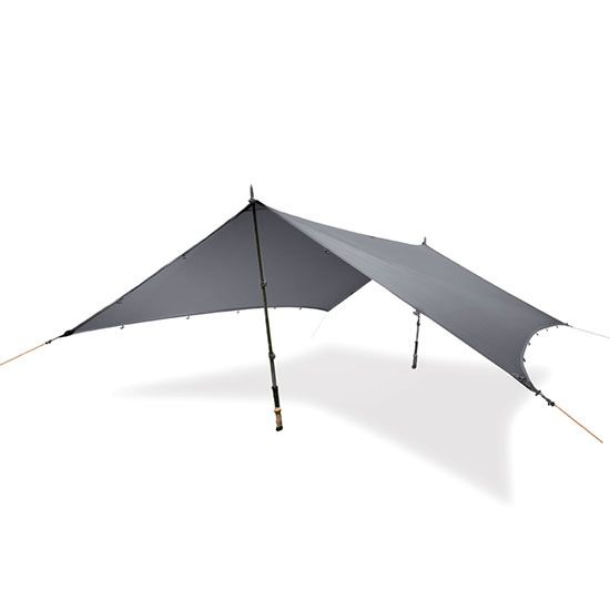 手裏剣シルエット。前後2辺のテンションスリーブ。21か所ものジョイントポイント。これらのユニークな機能により圧倒的な張りやすさと設営バリエーションを実現。軽量コンパクトさとあいまってタープの可能性を広げます。