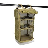 吊して収納する縦型収納棚、キャンプシェルフです。仕切りは収納内容に応じて1〜3室へ可変、本体を畳めば厚さは僅か8cm。フロントシェードを閉じると、蚊帳(かや)代わりとしても使えます。洗った食器や余った食材などを保管するのに便利。キッチン回りやテント内で活躍する、便利アイテムです。