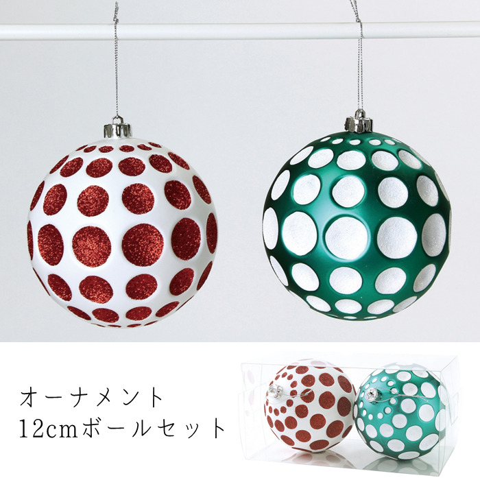 <ドット入りカラフルボールをデコレーションに>ドット模様のボールオーナメントです。サイズは直径12cm、トップ部分を含めた高さは13cm。ホワイト地にレッドのドット、グリーン地にホワイトのドットの2種類のボールです。ボールのカラーコンビネーションはインパクト大で、ツリーに飾ったり、室内に飾ったりと、クリスマスシーズンを楽しく飾ってくれること間違いなしです。