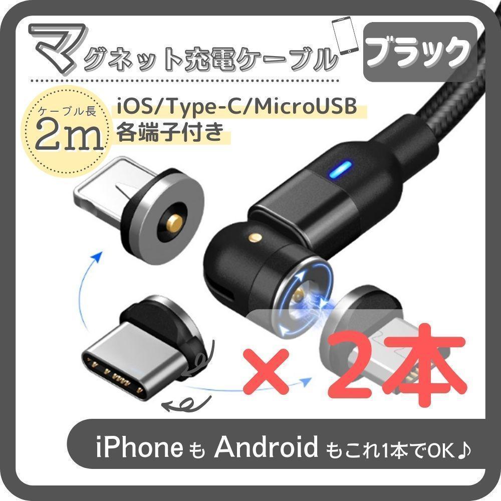 マグネット充電ケーブル ブラック 2m 2本 光る 急速 USB iPhone