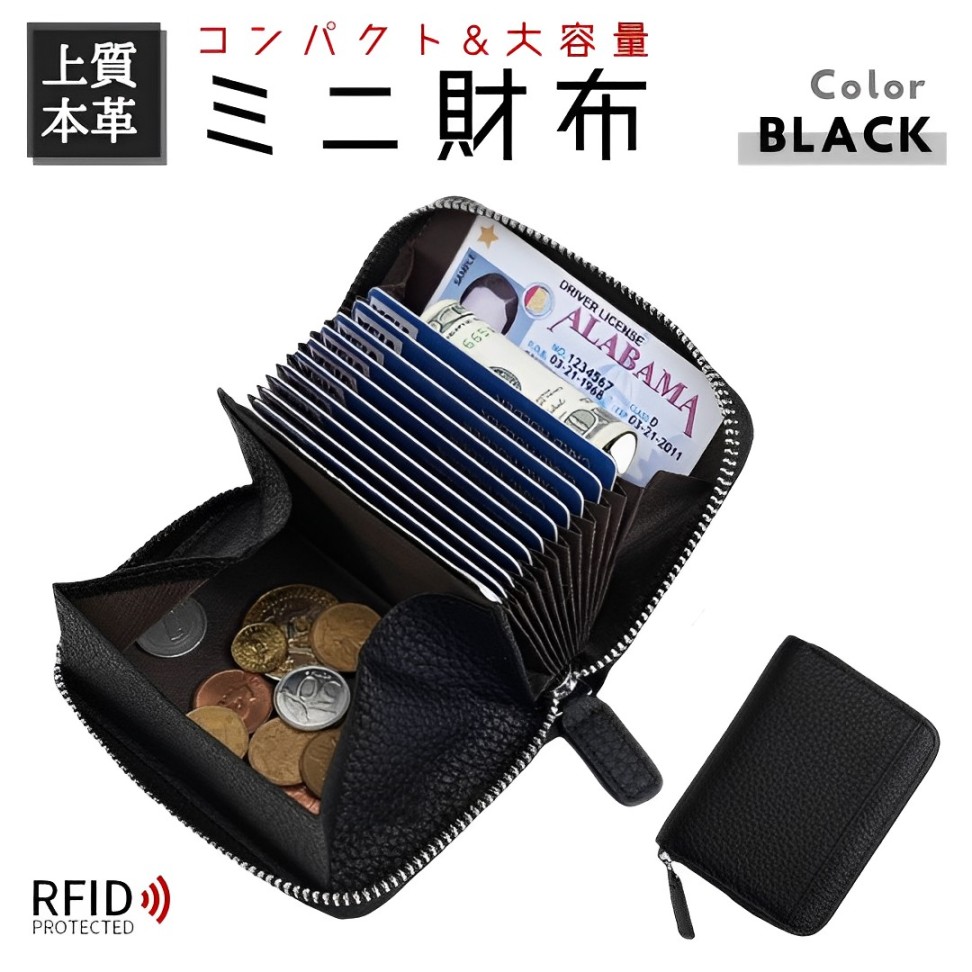 ミニ財布 カードケース コインケース じゃばら BOX型 本革 ラウンドファスナー コンパクト 大容量 メンズ レディース ブラック