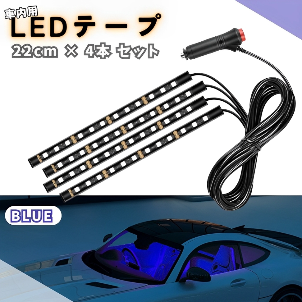 LEDテープ シガーソケット スイッチ付き ブルー 4本 ルームランプ 自動車 車内 足元ライト 照明 装飾 LEDテープライト 12V ネオン