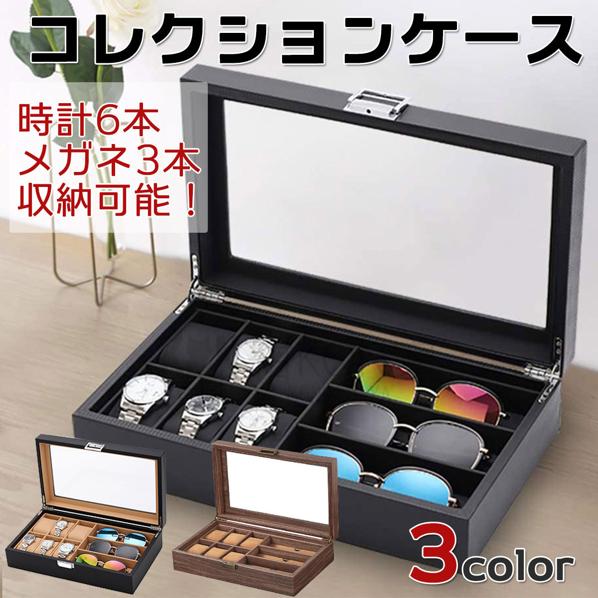 メガネボックス 時計ケース 高級 収納ボックス 腕時計 サングラス メガネ 重厚感 高品質 ガラス天板 ディスプレイ インテリア コレクションケース 6本+3本