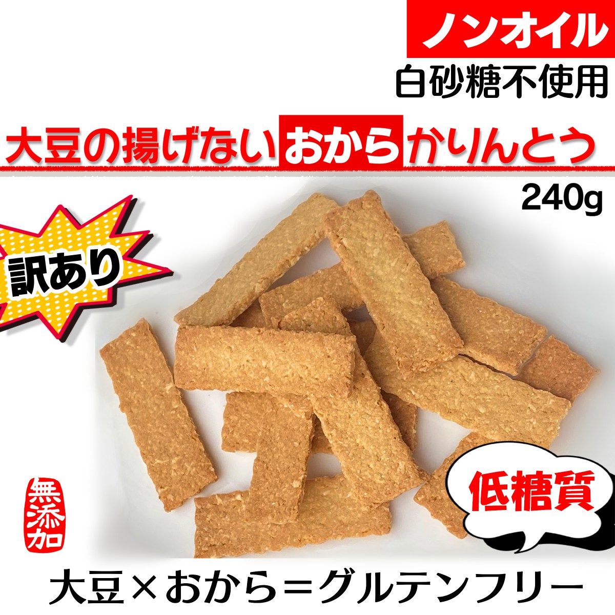 油不使用・乳製品不使用・白砂糖不使用バターやオイルを使わない、完全ノンオイルのおからかりんとうです。小麦不使用でグルテンフリー だからヘルシー!