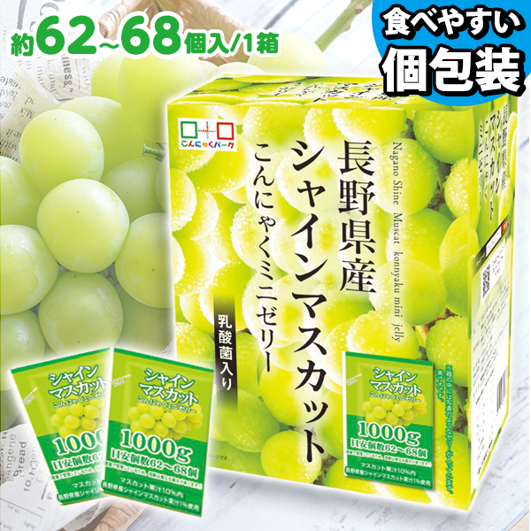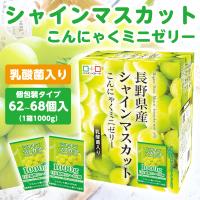 | おやつや小腹が空いたときに手軽に食べられるシャインマスカットこんにゃくミニゼリー。個包装1個あたり乳酸菌10億個入り。冷蔵庫で冷やせば、さらに美味しくお召し上がりいただけます。持ち運びに便利な個包装タイプのゼリーが1箱約62〜68個入っています。(重量で管理しているため、個数は異なる場合があります。) |
