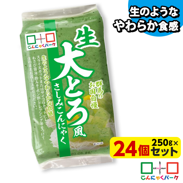 | こんにゃくパーク独自の製法で生大とろ風に造り上げた生のようなやわらかな食感のさしみこんにゃくです。スライスカットまたはサイコロカットにして、わさび醤油、酢みそ、ポン酢、ドレッシング等をつけて生のままお召し上がりください。 |