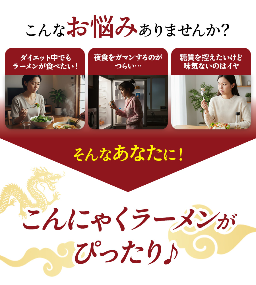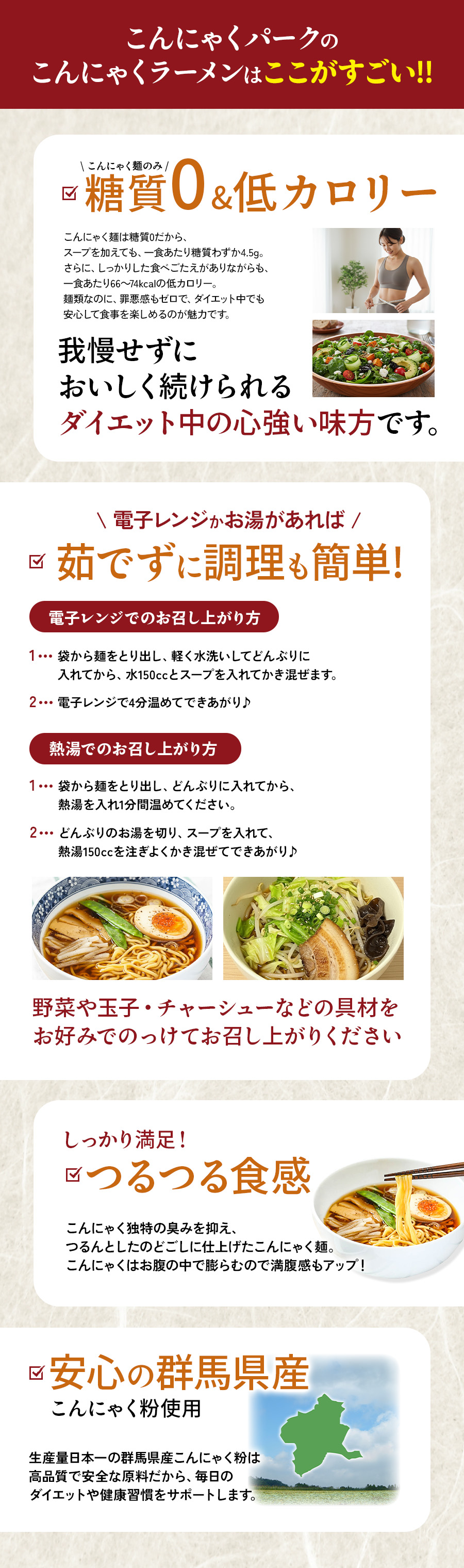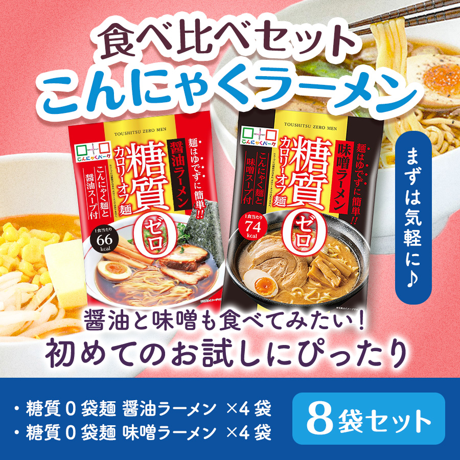 | こんにゃくパークの人気商品の糖質カロリーオフ麺「醤油ラーメン」「味噌ラーメン」の食べ比べセットです。糖質制限が必要な方、糖質を控えたい方にぴったりです。 |
