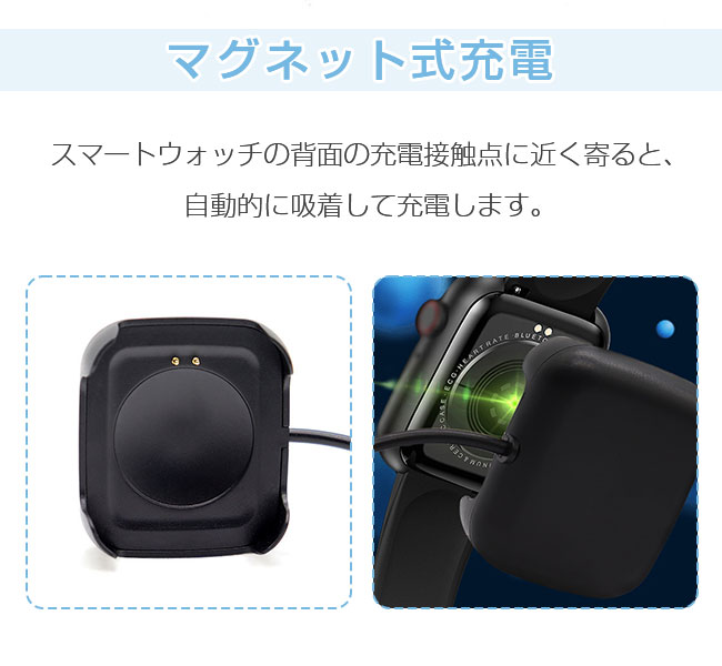 スマートウォッチの背面の充電接触点に近く寄ると、自動的に吸着して充電します。