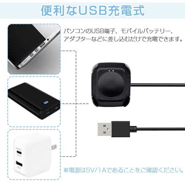 パソコンのUSB端子、モバイルバッテリー、アダプターなどに差し込むだけで充電できます。