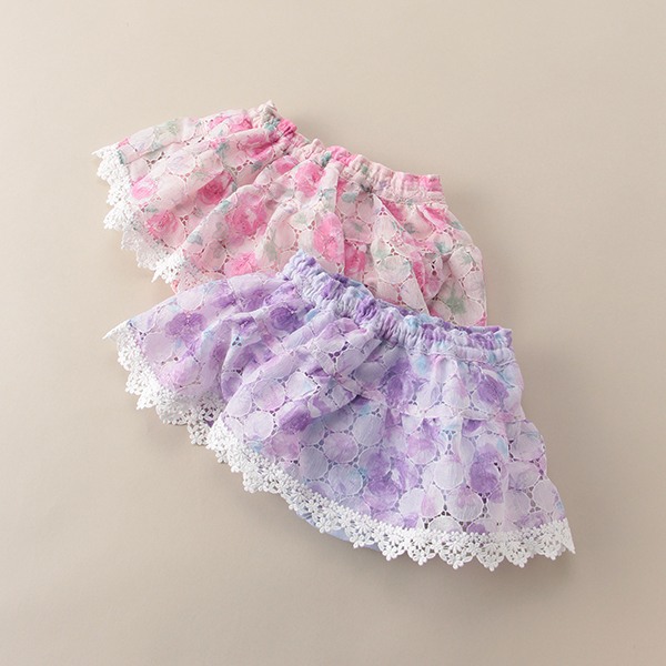 レースの上からみずみずしい水彩をのせたさわやかなカバーパンツです。