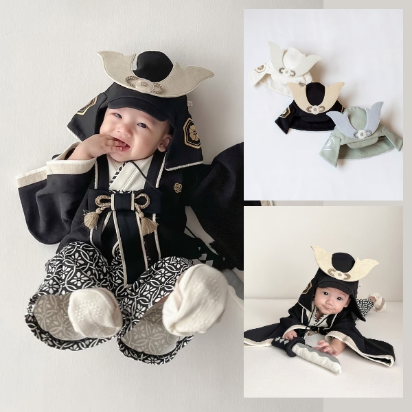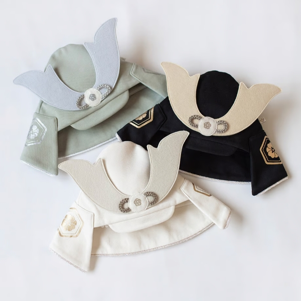 節句のイベントや、記念日の撮影にぴったりのかぶれる布製兜です。 頭を締め付けず、やわらかい素材感なので帽子が苦手なお子様にもおすすめ。 しっかりと自立するたてもの(角飾り)が存在感抜群。 キラッと光るラメ糸を混ぜ込んだ組紐がさりげないアクセントになっています。 袴シリーズや、お手持ちの和服と合わせたスタイルがおすすめです。
