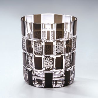 色被せガラスに、細かな幾何学模様と市松模様が施されています。
