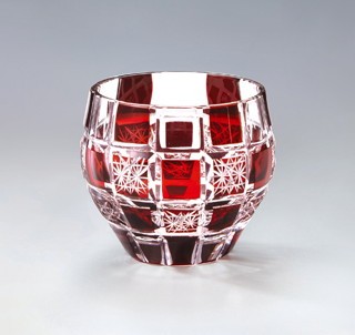色被せガラスに、細かな幾何学模様と市松模様が施されています。