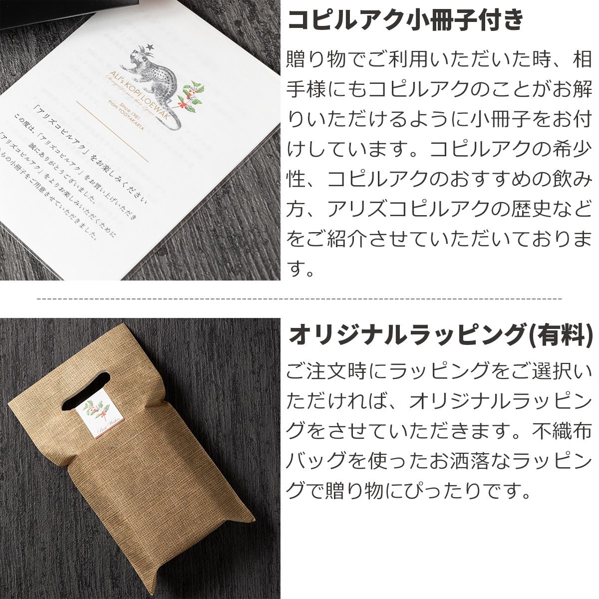 アリズコピルアクは、天然ジャコウネコが自然に食べたコーヒーの実のみを使っています。ジャコウネコは完熟した一番おいしいコーヒーの実しか食べませんので、自然と最高のコーヒーができる原料となります。