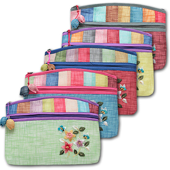 カラフルなキルト模様や刺繍、お花のような紐の先の飾りが、とってもかわいいポーチです。