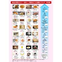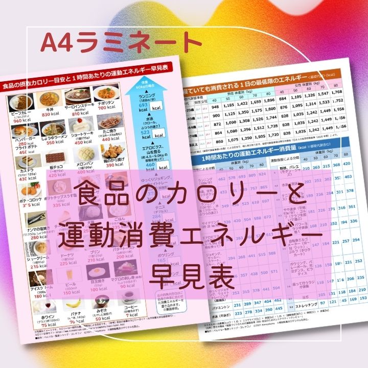 主な食品で摂取できるカロリーと、運動による消費エネルギーをひと目で対照できる早見表です。
