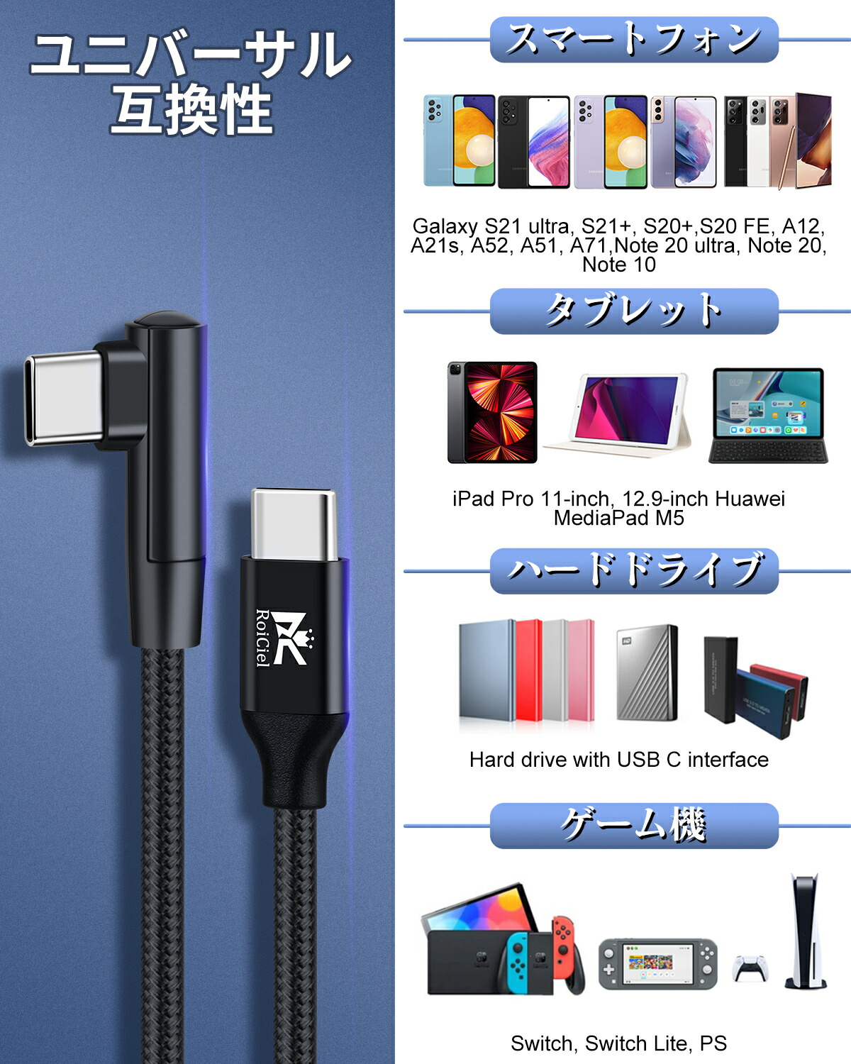 | ほぼすべてのUSB-C機器に対応:IPhone15 IPad MacBook、Dell XPS 13/15、HP Spectre X360、Envy 13t、Asus Zenpad、Lenovo Yoga 900 720、iPad Pro 2018、Galaxy S10 S9+、Nexus 5X/6P、Ninten-do Switch、GoPro Hero 7 、P30/P20 Pro/P10/Mate10などいろんなCタイプ機種に対応します。 |