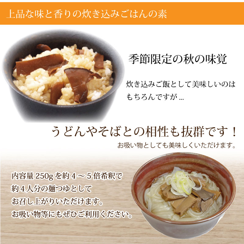 米3合とあわせて炊くと出来上がる炊き込みごはんの素具材は松茸ときのこ(エリンギ、ひらたけ)のみで、上品な味と香りはもちろんの事、さらに味わいをひきたてるよう2種類の醤油と鰹の香りをうまく調理しただしを加えました。